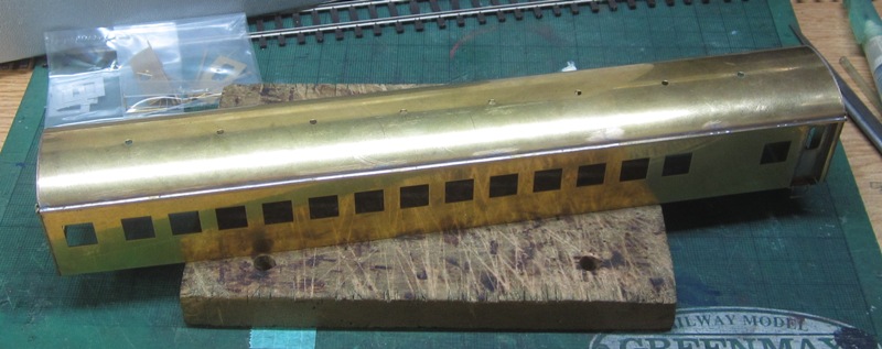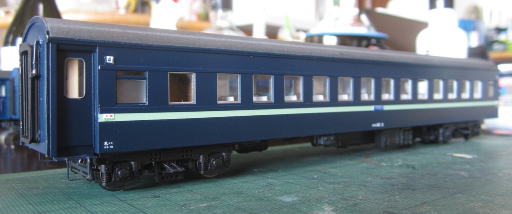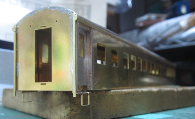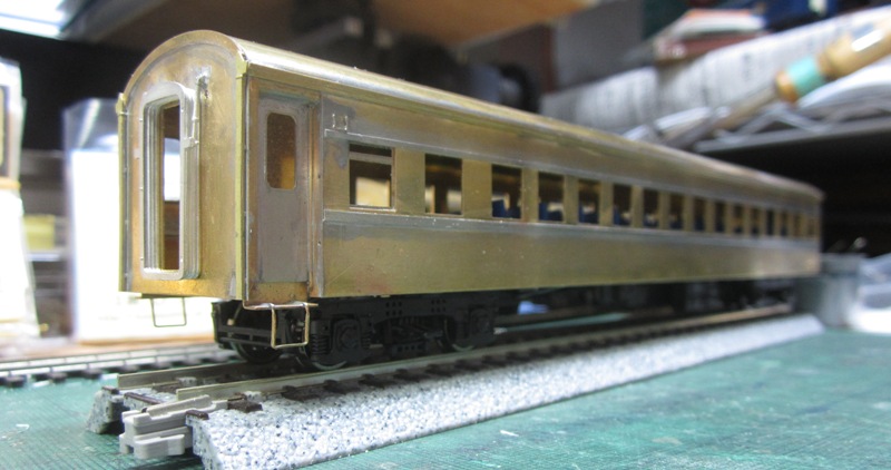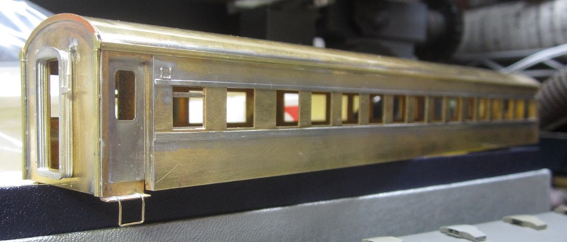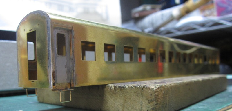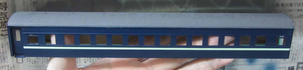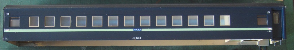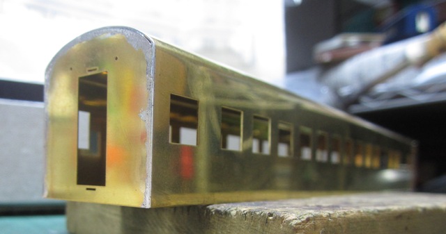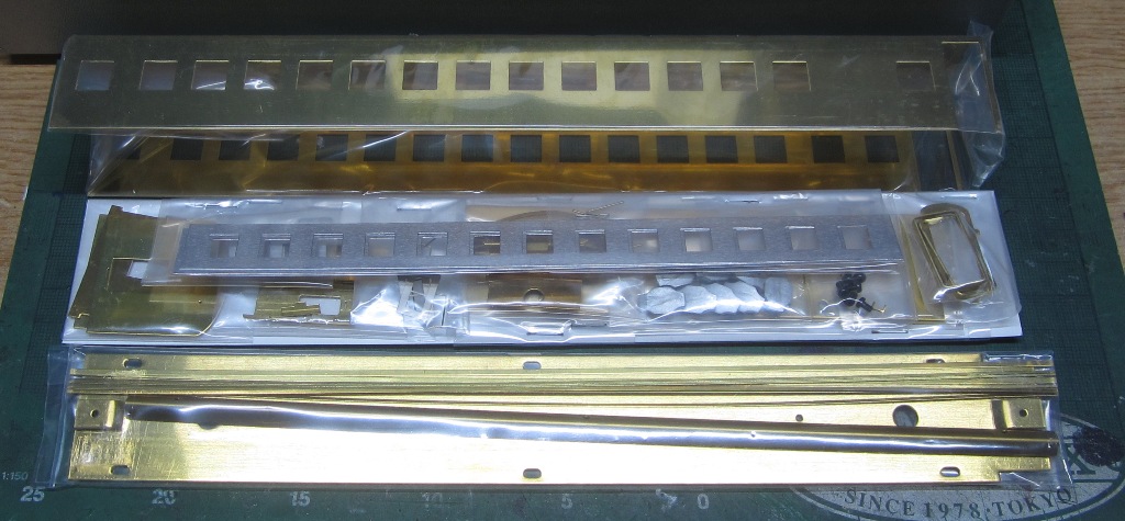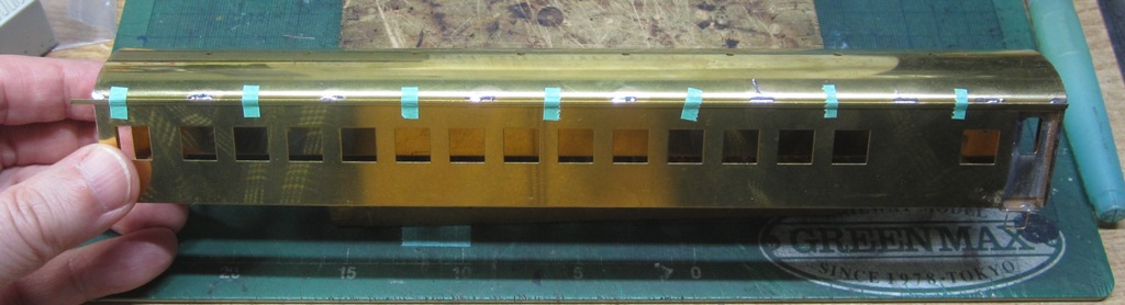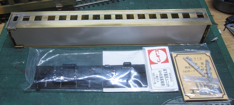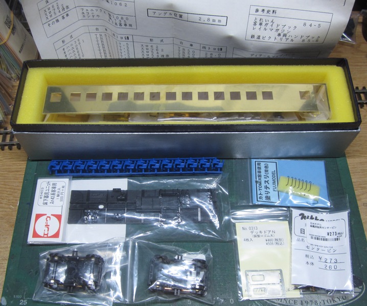 急行大雪 スロ52を組む。 大雪6号の編成表を見ると1等車はスロ52となっています。ネットでよく見る大雪6号のグリーン車はスロ54500だし、 屋根上のユニットクーラーが格好良いのでまずはスロ54500を組んだけど、近代化改造後のスロ52も良いなと フジモデルのスロ51(アルミ窓枠)ブラスキットを買ってありました。 何時買ったかもわからないくらい前に買ったものですが、大雪6号のバリエーションとして組もうと思います。 最新へジャンプ R8/02/02まで 週末は模型三昧を決め込んでいますので、必ず何らかの工作をしています。そりゃカミさんと買い物に行ったり、食事をしにいったりするけど、基本的に模型作りばかりしていて、暇を見て他の事をやるくらい模型工作中心の生活です。 若い頃にこれじゃカミさんに怒られるだろうけど、アラカンの今は模型作り中心の生活を(たぶん)認めてくれている(様子な)ので、存分に工作ができて有難く思っています。定年後も続いているとよいけど。 恒例のキットの状態です。真鍮地が美しい。このキットはアルミ窓枠なので窓枠を半田付けする必要がありません。なので組立てが格段に楽です。 今回使おうと思っているパーツ群です。改装形にするのでドアはHゴムタイプにします。帯の塗り分けがあるので、今回は塗りテスリが使えるかも。一等車なのでリクライニングシートを入れる予定です。 スロ54で使ったシートが市場在庫がなくてオークションでは高騰していたため、普通車のリクライニングシートを使用してみようと思います。 床下機器はあっさりとエンドウのお手軽パーツでお茶を濁すつもりです。 早速デッキドア工作から取り掛かります。 ドアは工房ひろ0313デッキドアNを使ってみます。今度はメーカー違いですがドア枠にピッタリとはまりました。補助階段をt0.3×0.6mm帯板を曲げて作りました。25mmで切り出して両側10mmで曲げて、10-5-10mmの門型にしたら、下側4-5mmで90度曲げ、5.5mm高で曲げて、ステップ部分の寸法に合わせて余分を切断しました。 半田で組み立てました。補助階段の取付位置は適当です・・・ デッキドアを側板に半田付けし、仕切板を半田付けしたら妻板をマステで仮止めして様子を見ます。 肩のRが微妙に違いますが、これは修正できないのでこのまま進めます。 妻板を半田付けしました。 のっぺらぼうですね。最後にはキャンバス抑え、雨トヨが付きますが、編成の中に埋もれますのでその他銘板とか、尾灯掛けとか面倒なものはは省略しちゃいます。 雨トヨを半田付けします。いつものようにマステで仮止めして、ノギスで高さを確認しながら点付けで半田付けしていきます。 点付けし終わりマステを除去しました。この後本付けします。 R8/02/15まで 今日は春の陽気でとても暖かく、桜の咲く頃のようでした。 毎日工作をしておりますが、低業績の仕事が頭をかすめて今一つ充実感が薄く感じています。改めて損な性格ですな、全く。 ストックしてあった高級パーツを使ってみることにしました。このパーツが使えるのはスハ43型でしょうが、この先いつ使えるかわかりません。「今でしょっ」て奴です。 このパーツ、取付足があったんですね。 取付けて分かったんですが、結構厚みがあります。実物の倍くらいありそうですが、真偽は調べず(苦笑)このパーツを消費することにします。 取付けて裾部分は車体下部と現合で切り落とし、上部にはキャンパス押えを取り付けました。 雨トヨを本付けして、キサゲました。 シルヘッダーを取り付けます。 t0.2洋白帯板をマステで仮止めして、半田をチョン付けしたら、 本付けしてキサゲました。 このスロ42は改装形(アルミ窓枠)なので、窓枠が塗装後なので楽です。 通販でパーツが到着したので取り付けます。 まずホロ枠セットを取り付けました。ホロ釣りは低温半田で接合、ホロは後付けするので仮止めです。 前位側、貫通扉も塗り分け後に接着するので仮止めです。 客車用トイレ洗面所窓枠(上段内折タイプ)を取り付け、号車札差を取り付けました。種別札差は帯塗装後に後貼りし、デッキ手すりも塗装後に別付けします。帯塗装がある車両はデッキ手すりがあるとマスキングし難いのです。 床下の工作に移ります。 床板は軽量化のためt1.0のプラパンを採用します。床下機器の工作はチト食傷気味だったりするもので、これまた過去のストックを使う事にして工数を削減します。代わりに、端梁はちゃんとしたものを付けようと思います。アンバランスかもですが、どこを凝りたいかという事ですね。 床下器具セットを取り付けてみました。付属のM3のネジで取り付けます。 一等車なのでちゃんとインテリアを組み込みます。スロ54で使ったTOMIXの485系グリーン車用リクライニングシートが使いたかったのですが、ストックなし。中古市場(ヤフオク)では高騰して手が出せなかったので、特急用シートを使う事にしました。 グリーン車用より一回り小さいのですが、スロ54用よりも前の特ロなので