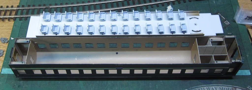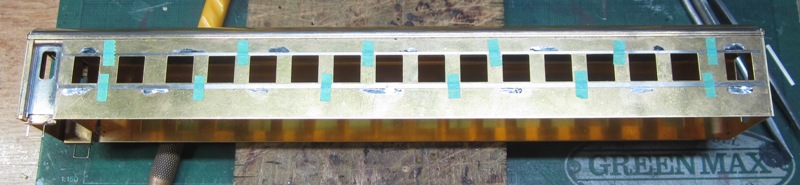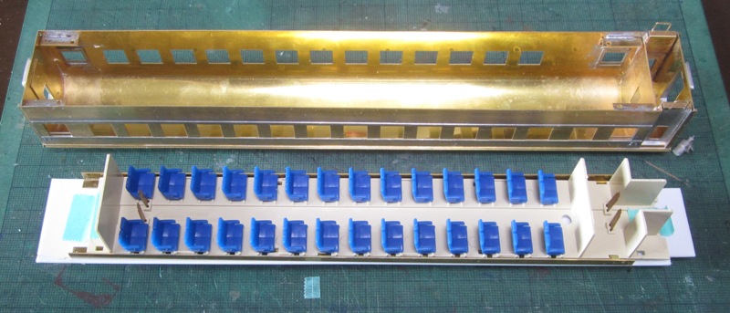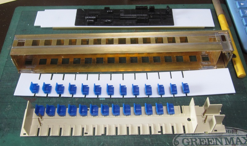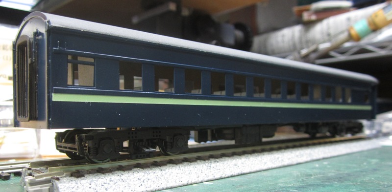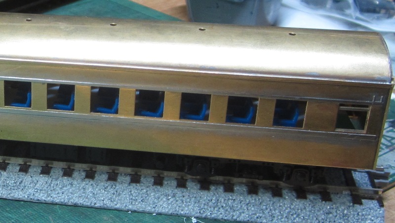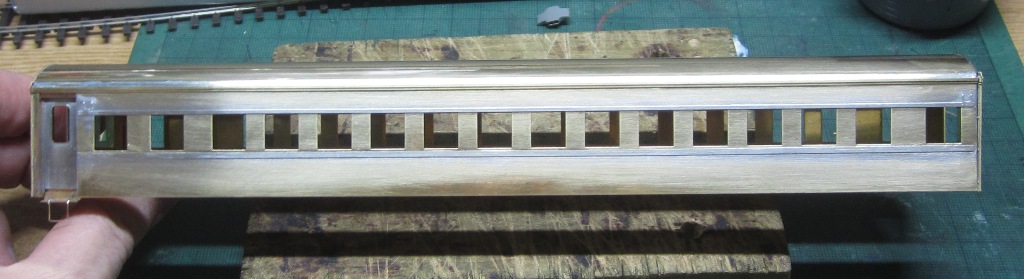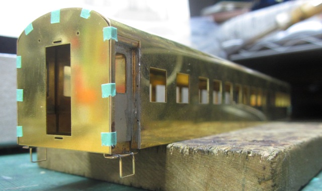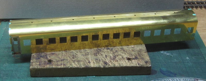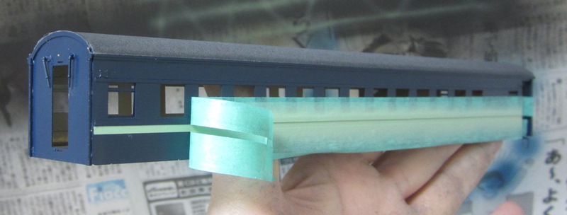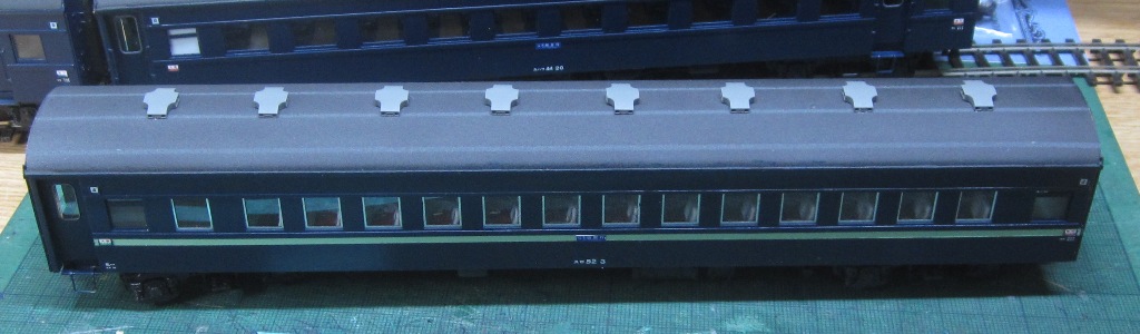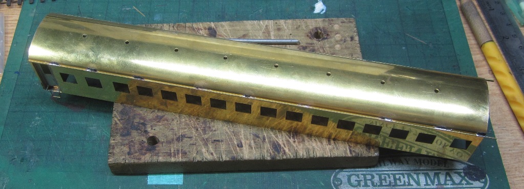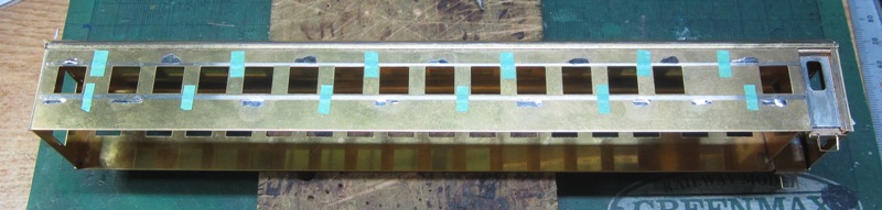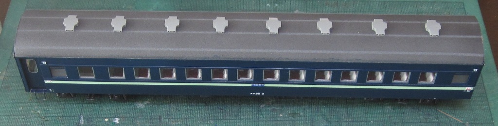 急行大雪 スロ52を組む。 大雪6号の編成表を見ると1等車はスロ52となっています。ネットでよく見る大雪6号のグリーン車はスロ54500だし、 屋根上のユニットクーラーが格好良いのでまずはスロ54500を組んだけど、近代化改造後のスロ52も良いなと フジモデルのスロ51(アルミ窓枠)ブラスキットを買ってありました。 何時買ったかもわからないくらい前に買ったものですが、大雪6号のバリエーションとして組もうと思います。 最新へジャンプ R8/02/02まで 週末は模型三昧を決め込んでいますので、必ず何らかの工作をしています。そりゃカミさんと買い物に行ったり、食事をしにいったりするけど、基本的に模型作りばかりしていて、暇を見て他の事をやるくらい模型工作中心の生活です。 若い頃にこれじゃカミさんに怒られるだろうけど、アラカンの今は模型作り中心の生活を(たぶん)認めてくれている(様子な)ので、存分に工作ができて有難く思っています。定年後も続いているとよいけど。 恒例のキットの状態です。真鍮地が美しい。このキットはアルミ窓枠なので窓枠を半田付けする必要がありません。なので組立てが格段に楽です。 今回使おうと思っているパーツ群です。改装形にするのでドアはHゴムタイプにします。帯の塗り分けがあるので、今回は塗りテスリが使えるかも。一等車なのでリクライニングシートを入れる予定です。 スロ54で使ったシートが市場在庫がなくてオークションでは高騰していたため、普通車のリクライニングシートを使用してみようと思います。 床下機器はあっさりとエンドウのお手軽パーツでお茶を濁すつもりです。 早速デッキドア工作から取り掛かります。 ドアは工房ひろ0313デッキドアNを使ってみます。今度はメーカー違いですがドア枠にピッタリとはまりました。補助階段をt0.3×0.6mm帯板を曲げて作りました。25mmで切り出して両側10mmで曲げて、10-5-10mmの門型にしたら、下側4-5mmで90度曲げ、5.5mm高で曲げて、ステップ部分の寸法に合わせて余分を切断しました。 半田で組み立てました。補助階段の取付位置は適当です・・・ デッキドアを側板に半田付けし、仕切板を半田付けしたら妻板をマステで仮止めして様子を見ます。 肩のRが微妙に違いますが、これは修正できないのでこのまま進めます。 妻板を半田付けしました。 のっぺらぼうですね。最後にはキャンバス抑え、雨トヨが付きますが、編成の中に埋もれますのでその他銘板とか、尾灯掛けとか面倒なものはは省略しちゃいます。 雨トヨを半田付けします。いつものようにマステで仮止めして、ノギスで高さを確認しながら点付けで半田付けしていきます。 点付けし終わりマステを除去しました。この後本付けします。 R8/02/15まで 今日は春の陽気でとても暖かく、桜の咲く頃のようでした。 毎日工作をしておりますが、低業績の仕事が頭をかすめて今一つ充実感が薄く感じています。改めて損な性格ですな、全く。 ストックしてあった高級パーツを使ってみることにしました。このパーツが使えるのはスハ43型でしょうが、この先いつ使えるかわかりません。「今でしょっ」て奴です。 このパーツ、取付足があったんですね。 取付けて分かったんですが、結構厚みがあります。実物の倍くらいありそうですが、真偽は調べず(苦笑)このパーツを消費することにします。 取付けて裾部分は車体下部と現合で切り落とし、上部にはキャンパス押えを取り付けました。 雨トヨを本付けして、キサゲました。 シルヘッダーを取り付けます。 t0.2洋白帯板をマステで仮止めして、半田をチョン付けしたら、 本付けしてキサゲました。 このスロ42は改装形(アルミ窓枠)なので、窓枠が塗装後なので楽です。 通販でパーツが到着したので取り付けます。 まずホロ枠セットを取り付けました。ホロ釣りは低温半田で接合、ホロは後付けするので仮止めです。 前位側、貫通扉も塗り分け後に接着するので仮止めです。 客車用トイレ洗面所窓枠(上段内折タイプ)を取り付け、号車札差を取り付けました。種別札差は帯塗装後に後貼りし、デッキ手すりも塗装後に別付けします。帯塗装がある車両はデッキ手すりがあるとマスキングし難いのです。 床下の工作に移ります。 床板は軽量化のためt1.0のプラパンを採用します。床下機器の工作はチト食傷気味だったりするもので、これまた過去のストックを使う事にして工数を削減します。代わりに、端梁はちゃんとしたものを付けようと思います。アンバランスかもですが、どこを凝りたいかという事ですね。 床下器具セットを取り付けてみました。付属のM3のネジで取り付けます。 一等車なのでちゃんとインテリアを組み込みます。スロ54で使ったTOMIXの485系グリーン車用リクライニングシートが使いたかったのですが、ストックなし。中古市場(ヤフオク)では高騰して手が出せなかったので、特急用シートを使う事にしました。 グリーン車用より一回り小さいのですが、スロ54用よりも前の特ロなので
